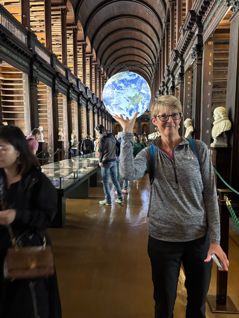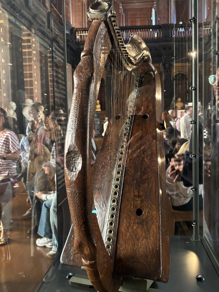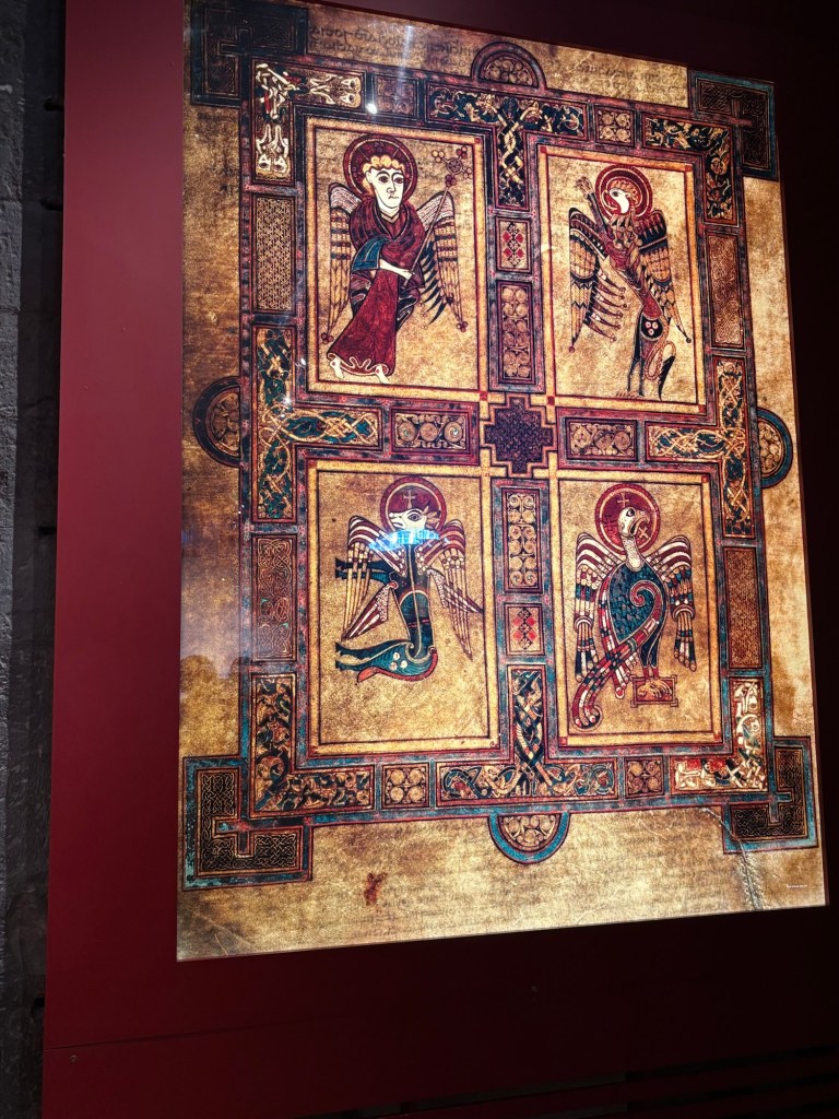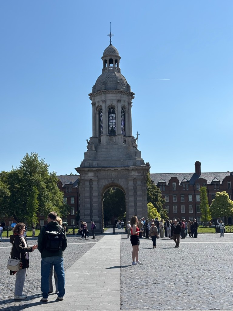 Today, May 13th, we were greeted with plentiful sunshine. After a very good breakfast we headed to Trinity College and the Book of Kells tour. (See some photos below). After the tour it was time for lunch and we headed to St. Stephens Green with some carry out. Following lunch we wandered down Grafton Street, a pedestrian only area with high end shops. I found a great gelato shop and indulged in some chocolate as we strolled to what was to be our highlight of the day – a Walking Tour of Dublin with Colm Hogan who provided a great history of Ireland and regaled us with several Irish Ballads. Of course after a walking tour it was time for Guinness for Connie and sparkling water for Laurette:). Happy hour was followed by a visit to the “Temple Bar” neighborhood on the south side of the River Liffey. Found an excellent Italian place named of all things Pinocchio’s! An after dinner stroll led to a variety of pubs playing music. The end of a great day.