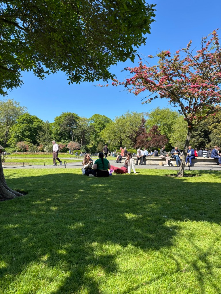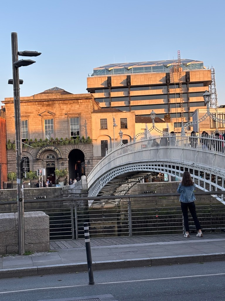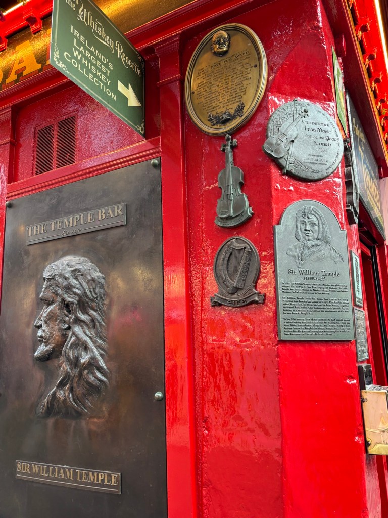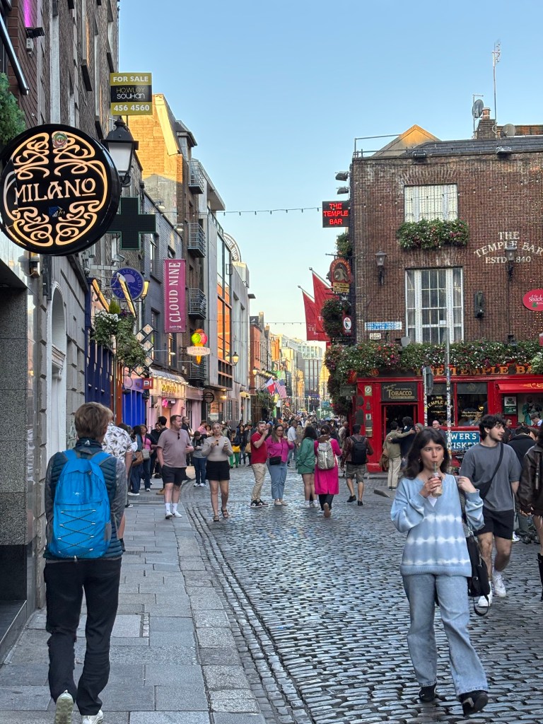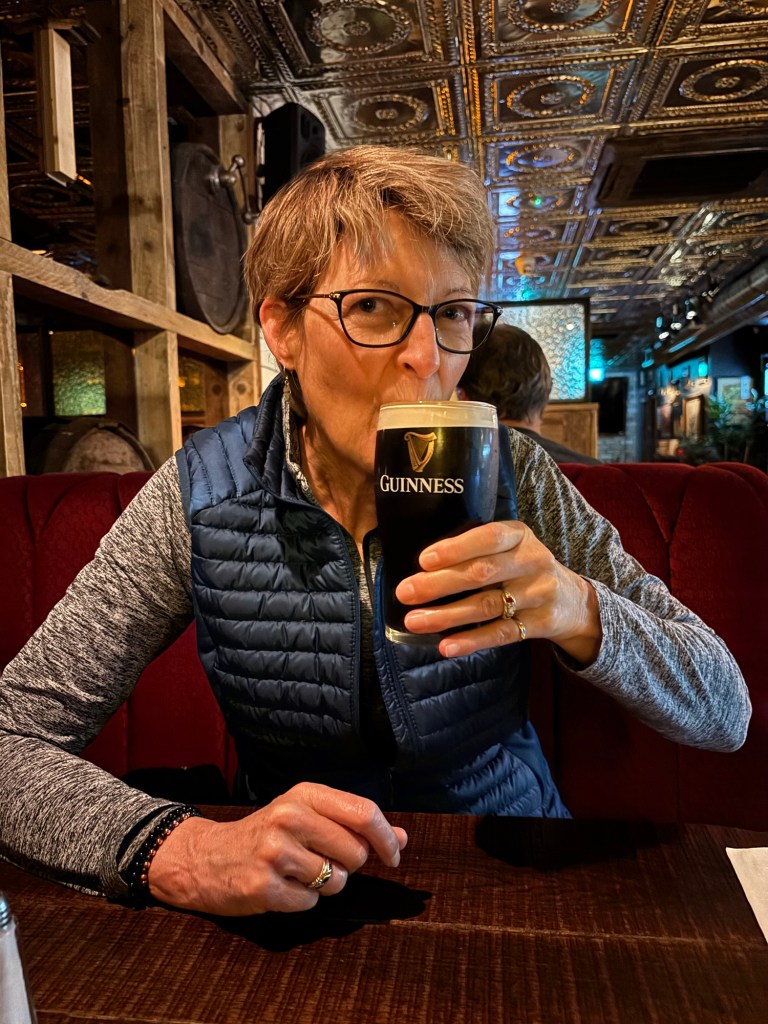Today, May 13th, we were greeted with plentiful sunshine. After a very good breakfast we headed to Trinity College and the Book of Kells tour. (See some photos below). After the tour it was time for lunch and we headed to St. Stephens Green with some carry out. Following lunch we wandered down Grafton Street, a pedestrian only area with high end shops. I found a great gelato shop and indulged in some chocolate as we strolled to what was to be our highlight of the day – a Walking Tour of Dublin with Colm Hogan who provided a great history of Ireland and regaled us with several Irish Ballads. Of course after a walking tour it was time for Guinness for Connie and sparkling water for Laurette:). Happy hour was followed by a visit to the “Temple Bar” neighborhood on the south side of the River Liffey. Found an excellent Italian place named of all things Pinocchio’s! An after dinner stroll led to a variety of pubs playing music. The end of a great day.
