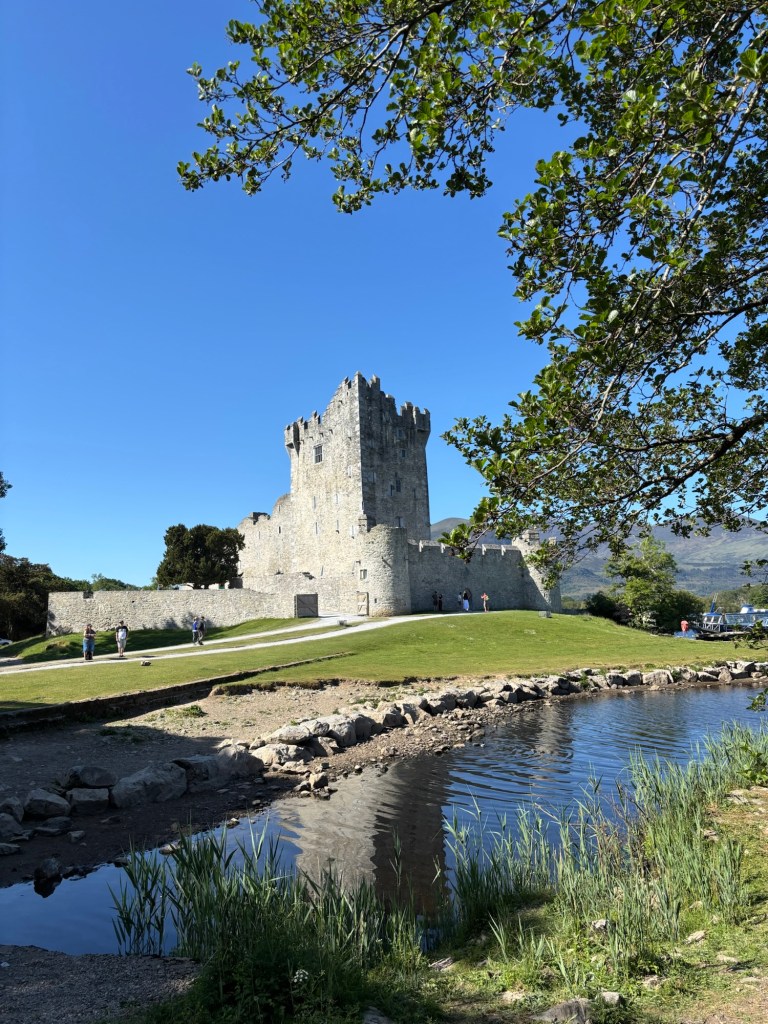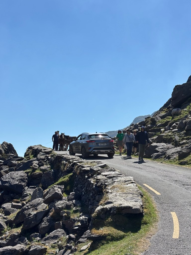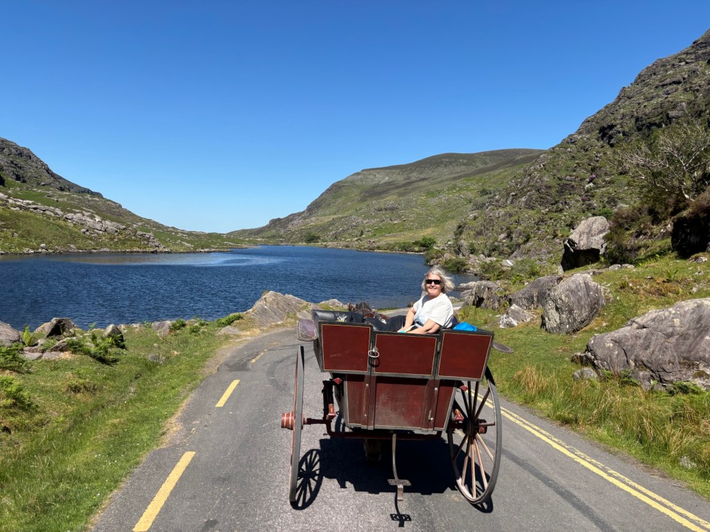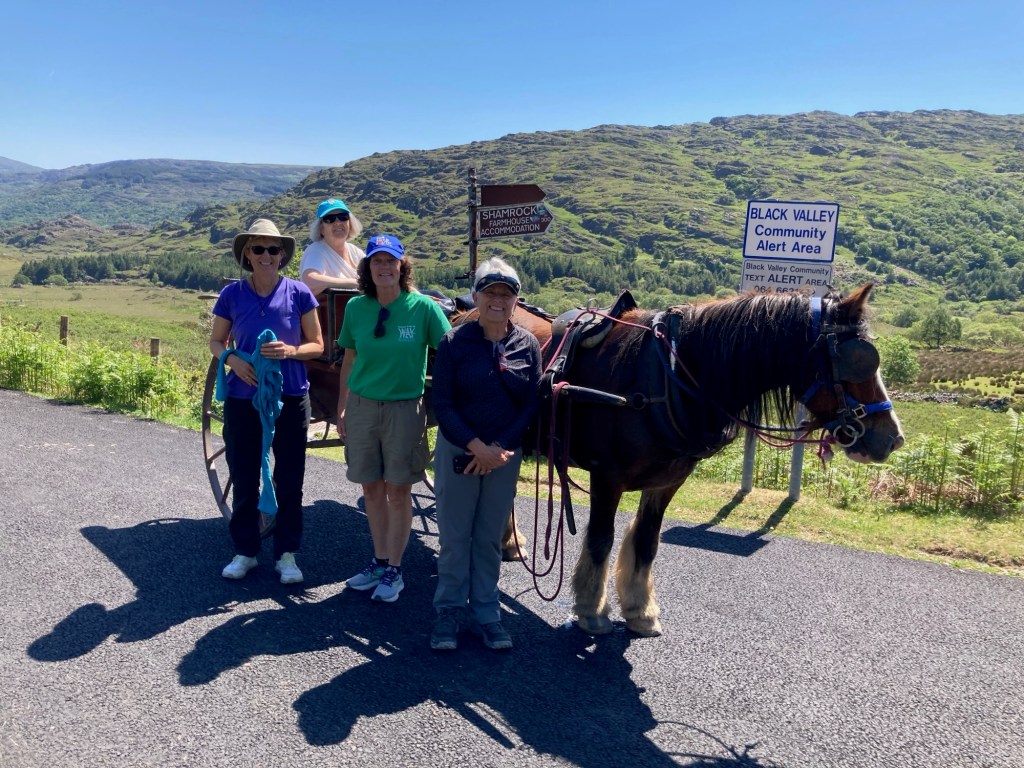 Our “free day” adventure – The Gap of Dunloe in the Killarney National Park. First stop was Ross Castle. Then we boarded a boat with 10 others to travel across 3 lakes in the Killarney National Park. We were joined by the boat operators dog, Bailey (adorable). The water was low in parts of the lakes and a one point we had to disembark and hike about 250 yards to the next lake. At the end of our boat trip across the lakes we had lunch at a small cafe before boarding our horse drawn jaunty to travel on a narrow road across the Dunloe Gap along with tourists in cars and on bicycles. Several times we were asked to walk/hike in order for the horse to take a break. At the end of our jaunty journey we, of course found ourselves in a small pub as our bus driver anxiously awaited us for our return trip to town.