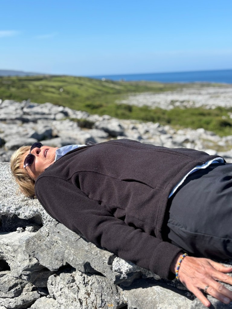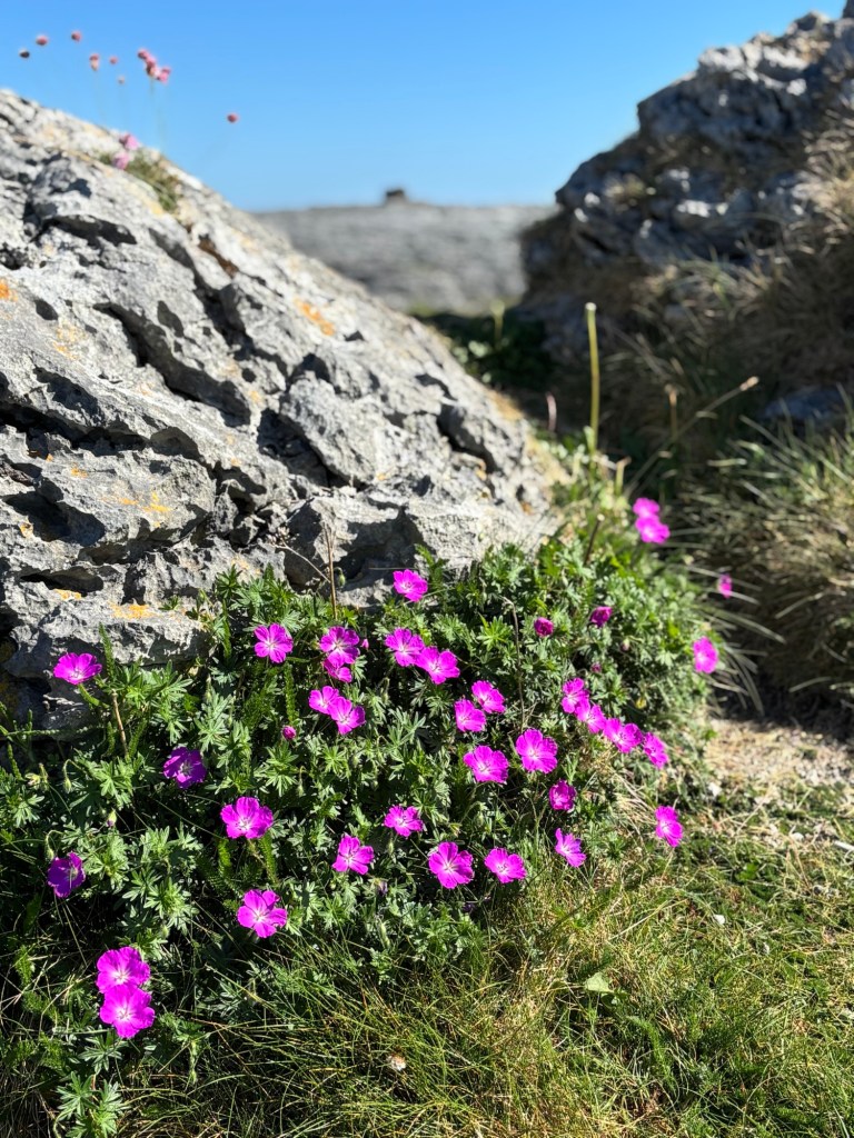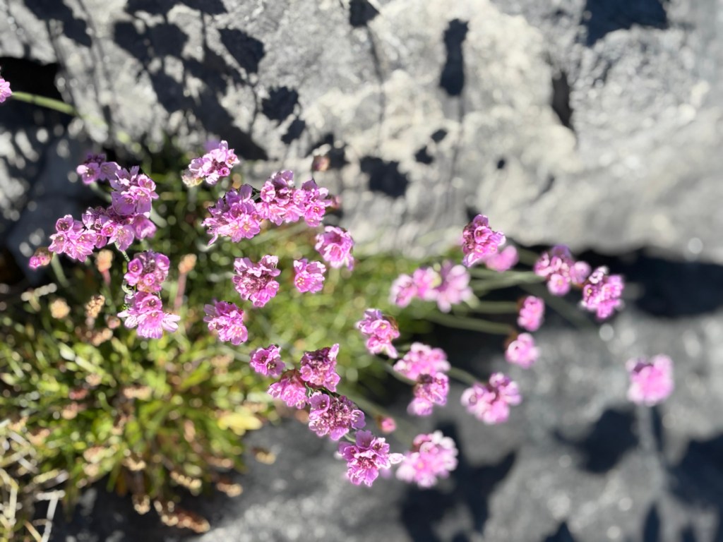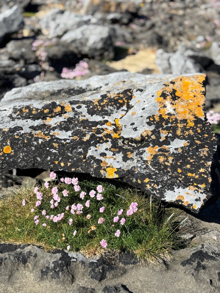 It’s anther 9 am departure from Lahinch to Doolin (a ferry departure spot for the Aran Islands) heading to the “Wild Atlantic Way” (a tourism trademark name). First stop is in the Burren region (a Natural Geo Park) where limestone rocks deposited during the ice age (361 million years ago) form a very unique landscape. Many wildflowers create a colorful patchwork.