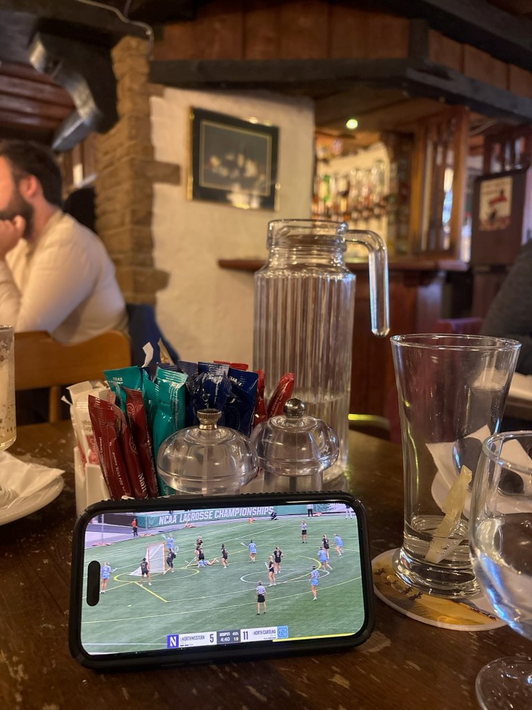Time to check in to our accommodations. We wandered a bit and found an Aldi’s. And we made a decision about dinner – The Olde Castle Bar. We had a lovely dinner and watched the DI Women’s NCAA Lacrosse Championship on my iPhone.